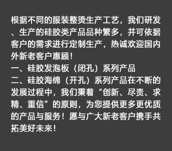 我公司生產(chǎn)的硅膠海綿(開(kāi)孔)系列產(chǎn)品具有耐高溫、透氣性好、耐壓性強(qiáng)等優(yōu)點(diǎn),是西服及高檔服裝整燙生產(chǎn)的必備產(chǎn)品。硅膠發(fā)泡板(閉孔)系列產(chǎn)品具有發(fā)泡均勻,耐高溫、耐壓性能好,其中新研制開(kāi)發(fā)的針孔浮點(diǎn)硅膠發(fā)泡板攻克了一般產(chǎn)品的浮點(diǎn)不飽滿的技術(shù)難題,一般產(chǎn)品的浮點(diǎn)不飽滿,容易擋住透氣孔,造成吸風(fēng)效果不良。我司的產(chǎn)品具有更好的透氣性和回彈性,以及更長(zhǎng)時(shí)間的試用壽命。